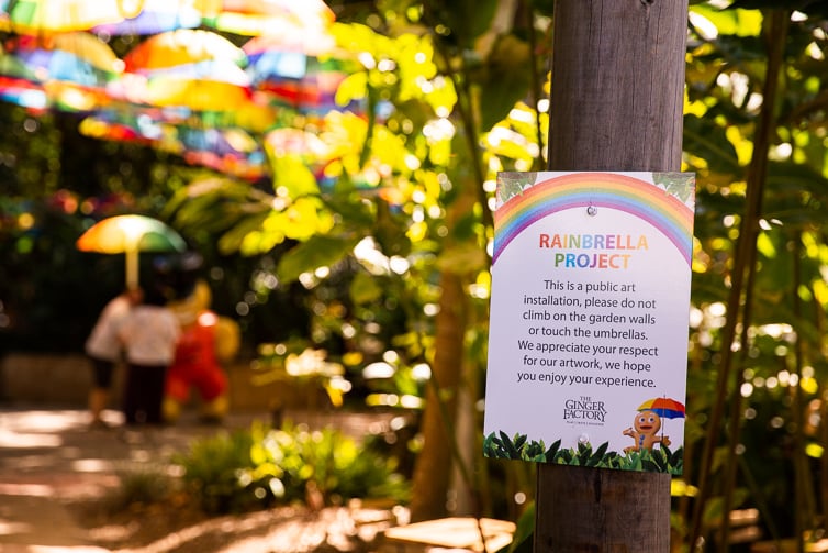 Make some time to explore the grounds – the rainbow umbrella art installation, the Rainbrella Project, is a wondrous site. Turtles and eels are in the pond and my kids enjoyed seeing the water dragons and bush turkeys making the Ginger Factory gardens their home.