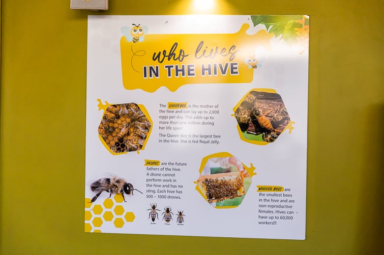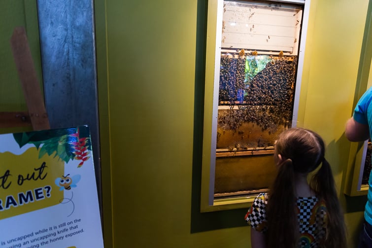 Four times daily, you can purchase tickets to enter the Super Bee Attraction and learn about the fascinating lives of honeybees. Presented by knowledgeable beekeepers, the presentation is engaging for young and old with lots of bee facts for kids.