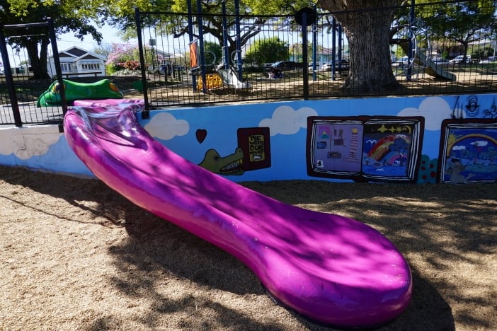Another Brisbane playground that gets an authentic replica in Bluey is Hill End Terrace Park in West End. Its standout features, which include a giant frog whose long pink tongue forms one of the playground’s slides and some storybook murals, can be seen in the cartoon.